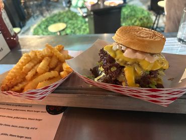 Smashed burger with American cheese, grilled onions, pickles and Moore sauce over crinkle cut fries