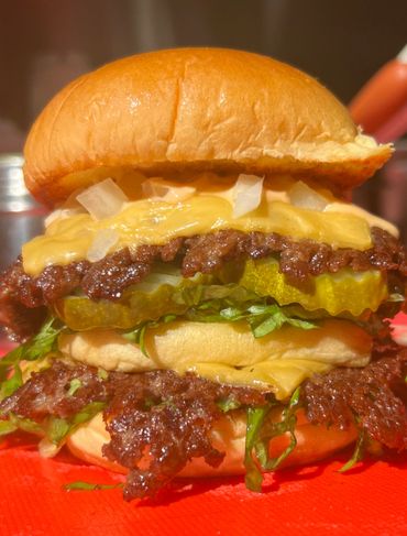 FOUR smashed beef patties w/ American Cheese, pickles & Moore Sauce on a grilled potato roll.