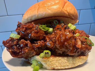 Asian inspired crispy buttermilk chicken, garlicky sweet heat sauce, scallions and sesame seeds on a grilled potato roll.